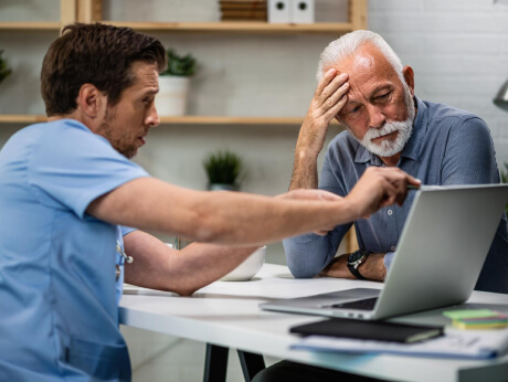Counselor attentively listening to a man speaking during a therapy session in a bright room.